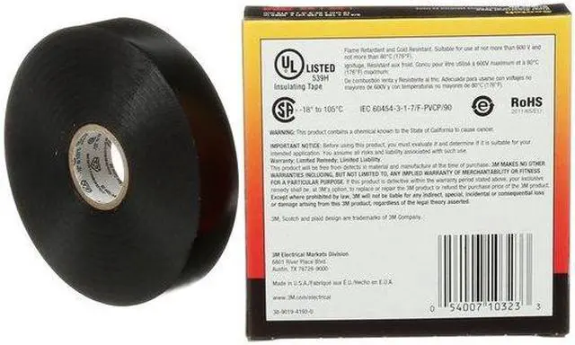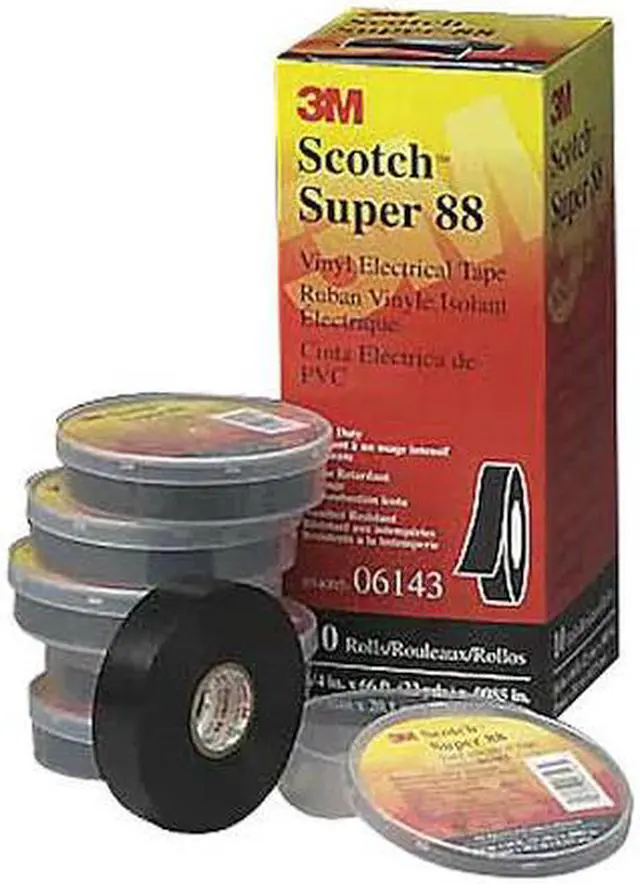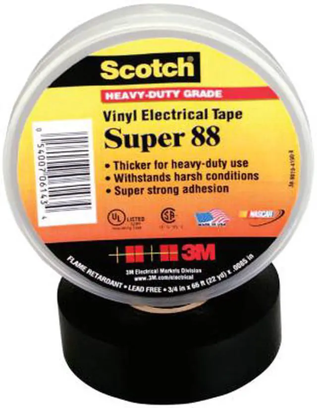 Insulating Electrical Tape, General Purpose, Vinyl, Tape Adhesive Material Rubber, 3/4 in, 108 ft, 8.5 mil, 3M (TM), Scotch (R), Series Super 88, Black, Minimum Tape Performance Temperature 0 Degrees F, Maximum Tape Performance Temperature 220 Degrees F, Voltage Rating 600 V, Continuous Roll, Single-Sided, Package Quantity 48. This item has been restricted from sale in the following state (s): []