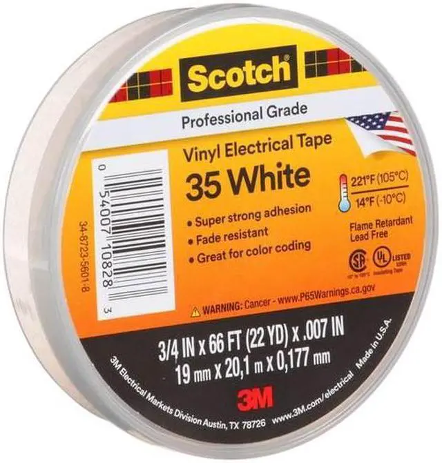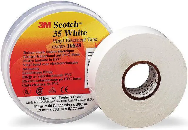 Electrical Tape, Tape Backing Material Vinyl, Tape Adhesive Rubber, Tape Thickness 7.00 mil, Tape Width 3/4 In., Tape Length 66 ft., Tape Shape Continuous Roll, Tape Color White, Max. Voltage 600, Max. Tape Performance Temp. 220 Degrees F, Tape Tensile Strength 17 lb./in., Tape Adhesive Strength 20 oz./in., Series 35, UV Resistance No, Standards UL Listed, UL 510, CSA Certified, RoHS 2002/95/EC, ASTM D1000, Tape Color Family White. This item has been restricted from sale in the following state(s): []