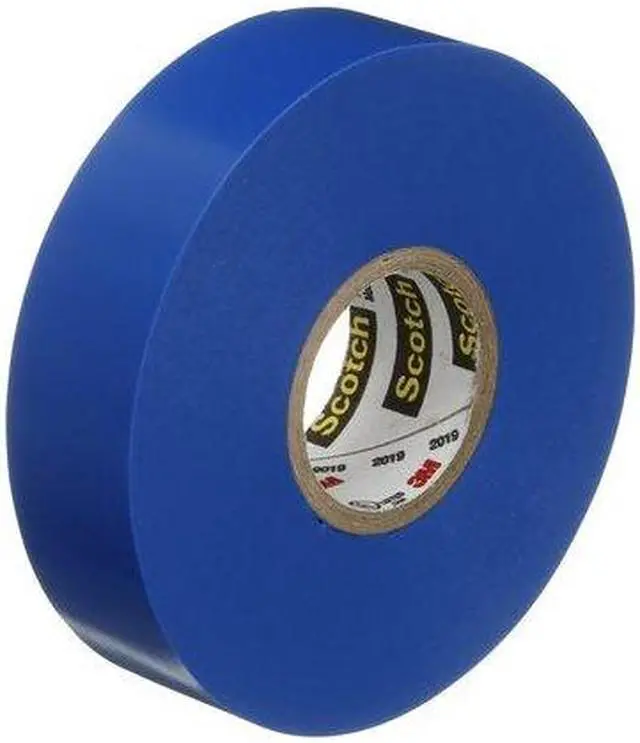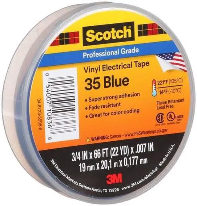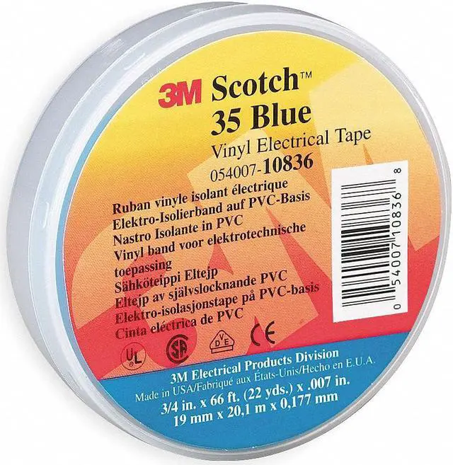 Electrical Tape, Tape Backing Material Vinyl, Tape Adhesive Rubber, Tape Thickness 7.00 mil, Tape Width 3/4 In., Tape Length 66 ft., Tape Shape Continuous Roll, Tape Color Blue, Max. Voltage 600, Max. Tape Performance Temp. 220 Degrees F, Tape Tensile Strength 17 lb./in., Tape Adhesive Strength 20 oz./in., Series 35, UV Resistance No, Standards UL Listed, UL 510, CSA Certified, RoHS 2002/95/EC, ASTM D1000, Tape Color Family Blue. This item has been restricted from sale in the following state(s): []