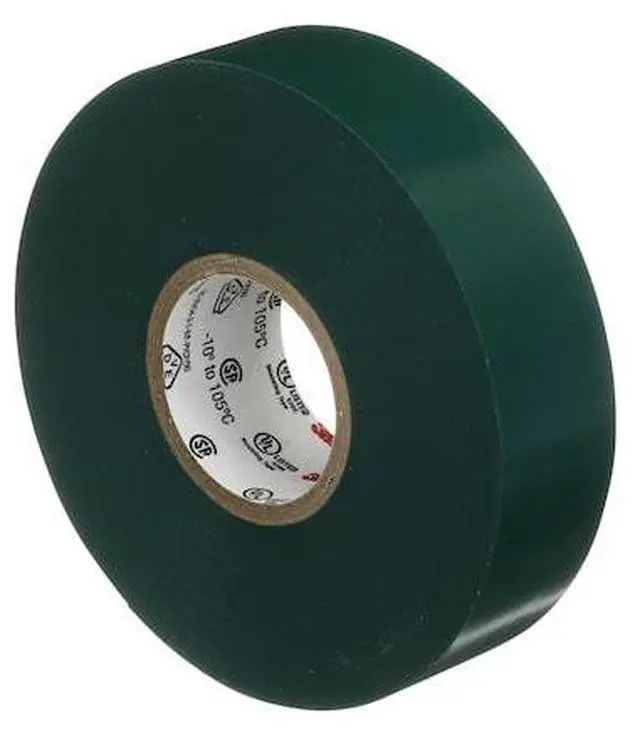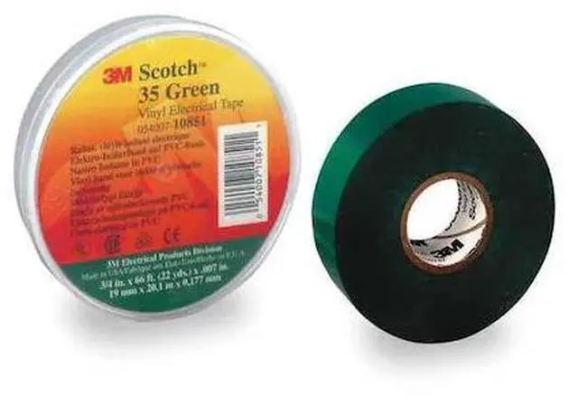 Electrical Tape, Tape Backing Material Vinyl, Tape Adhesive Rubber, Tape Thickness 7.00 mil, Tape Width 3/4 In., Tape Length 66 ft., Tape Shape Continuous Roll, Tape Color Green, Max. Voltage 600, Max. Tape Performance Temp. 220 Degrees F, Tape Tensile Strength 17 lb./in., Tape Adhesive Strength 20 oz./in., Series 35, UV Resistance No, Standards UL Listed, UL 510, CSA Certified, RoHS 2002/95/EC, ASTM D1000, Tape Color Family Green. This item has been restricted from sale in the following state(s): []