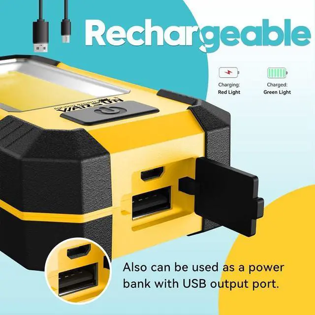 Powerful COB LightThe rechargeable work light delivering maximum brightness of 1200LM, this 30W COB LED work light is powered by rechargeable 3600mAh battery and features a USB port to charge your mobile or other devices. Crafted from durable aluminum alloy, it's drop-resistant up to 4.9 ft.