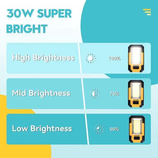 ? 3 Modes For Widely UseSwitch the led work lights between high, medium, and low brightness modes to meet your diverse lighting needs. Easy to operate with a single button, this portable work light is built to last and ensure reliable performance.
