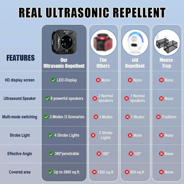 ![]() Our Ultrasonic Repellent | ![]() The thers | ![]() old Repellent | ![]() Mouse Trap | |