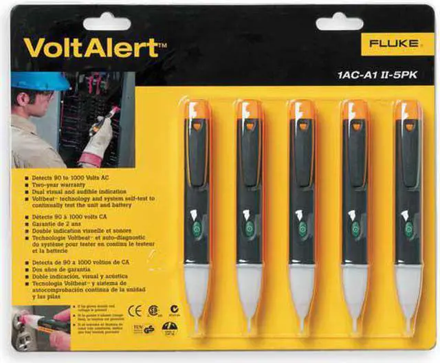 Voltage Detector, Voltage Range 90 to 1000V AC, Indication Audible/Visual, Audible Alert Yes, Battery Type AAA, Safety Rating CAT IV 1000V, On/Off Switch Yes, Length 5 in, Switch Type Push Button, Special Features Circuit Integrity with A Periodic Double Flash Visual Indication, Continually Tests Battery, Operating Temp. 14 Degrees to 122 Degrees F, Includes (2) AAA Batteries, Instructions, Manufacturers Warranty Length 2 yr, Package Quantity 5. This item has been restricted from sale in the following state (s): []