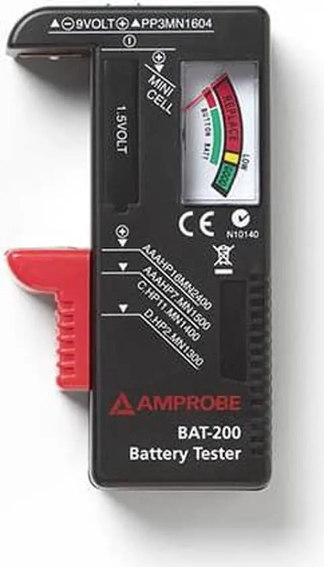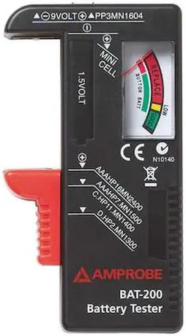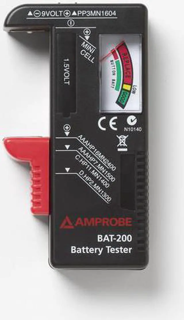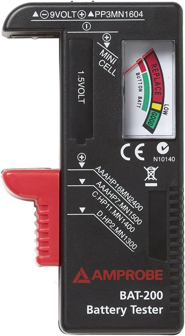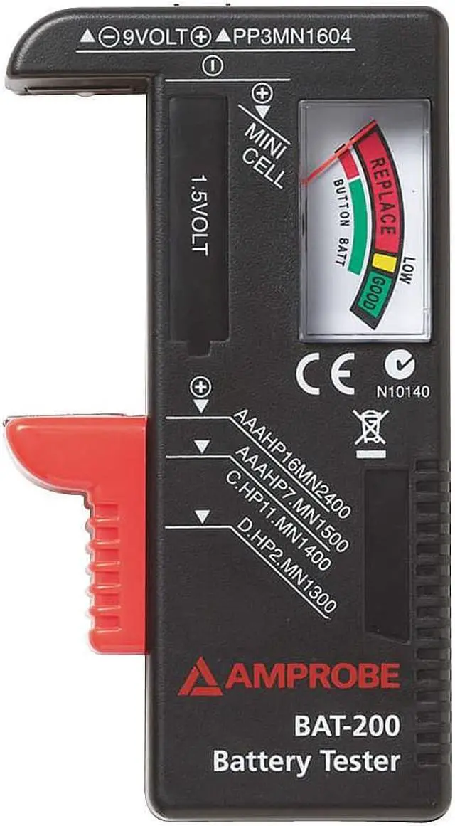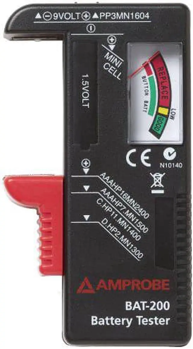 Battery Tester, Product Type Battery Tester, Overall Width 4 3/8 in, Overall Height 7 3/8 in, Overall Depth 1 1/8 in, Batteries Tested 15V, 9V, Load Amperage Not Applicable, Maximum Input Voltage 9 V DC, Minimum Input Voltage 1 1/2 V DC, Maximum Cold Cranking Amperage Not Applicable, Minimum Cold Cranking Amperage Not Applicable, Display Type Analog, Includes Tester Batteries Yes, Digital Display Screen Type No Display, Manufacturer Warranty Length 1 yr, Includes Instructions. This item has been restricted from sale in the following state (s): []