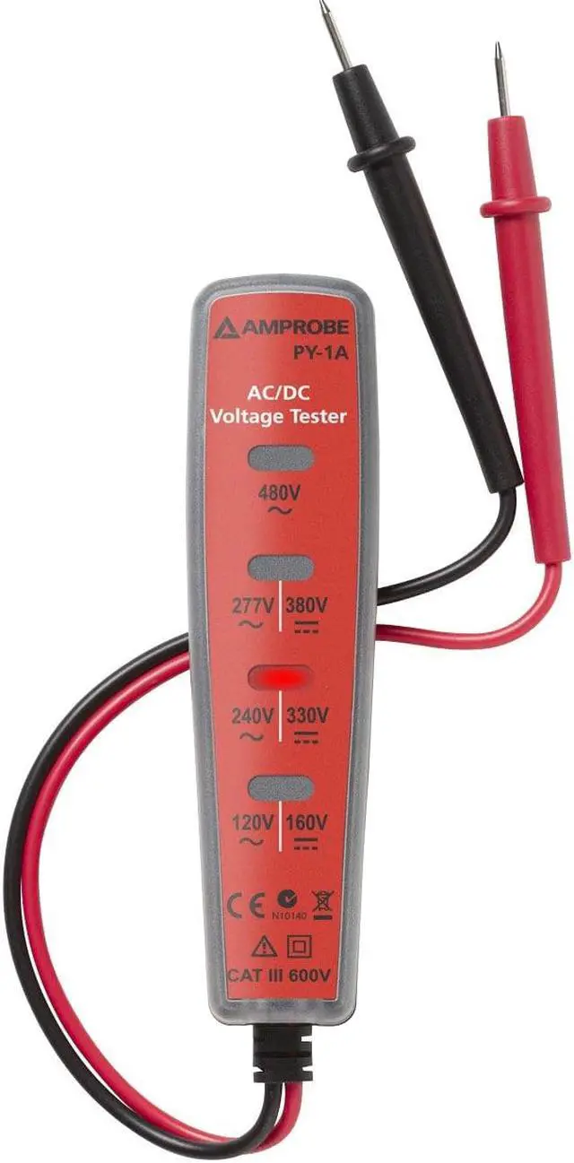 Voltage Tester, Alert Type Light, Built-In Flashlight No, CAT Safety Rating CAT III 600V, Cable Length 6 in, Display Type No Display, Maximum AC Voltage Measured 480 V, Maximum DC Voltage Measured 480 V, Non-Contact No, Test Connection Type Probe Tip, Testing Functions AC Voltage, DC Voltage, Features Built-In Test Leads Holder, Simple One Hand Operation, No Buttons or Setups, Small Pocket Size, Test for Presence of Voltage and Indicates Voltage Level, Tester Type Voltage Detector/Tester. This item has been restricted from sale in the following state (s): []