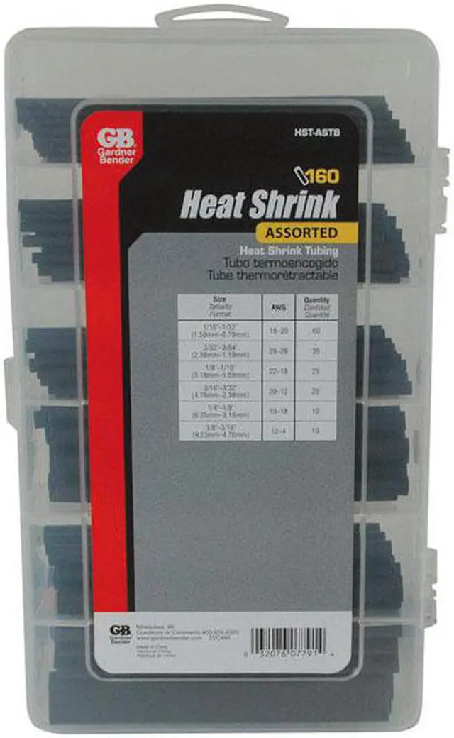 Put safety first with durable, flame-retardant tubing that is ideal for cable insulation, repair, marking or bundling. The Gardner Bender HST-ASTB Heat-Shrink Tubing Assortment includes 160 tubes in six sizes (2:1 shrink ratio), plus organizer storage case. Each thin-wall heat-shrink tubing not only provides superior mechanical, abrasion and moisture protection but also strengthens connections and provides a comfortable gripping surface. As a result, professional and DIY multi-purpose uses include repairing cords (ranging from large appliance cords to small electronic cables that show wear at pull-out); covering tool and sporting equipment handles; and sealing rope for neat, unravel resistant ends. Upon heating to 120 C (250 F) the tubing begins to shrink but will not drip, crack or flow. Plus, it is self-extinguishing within 30 seconds. Meets UL 224, 125 C: CSA C22.2 No3 198.1, 125 C; MIL-DTL-23053/5, Class 1 and 2, AMS 3636 and 3637; DEF STAN 59-79, Issue 3 Type 2a. Continuous operating temperature: -55 C (-67 F) to 135 C (275 F). Shrink temperature: 120 C (250 F) to 250 C (480 F). 600 V/Mil Dielectric strength.