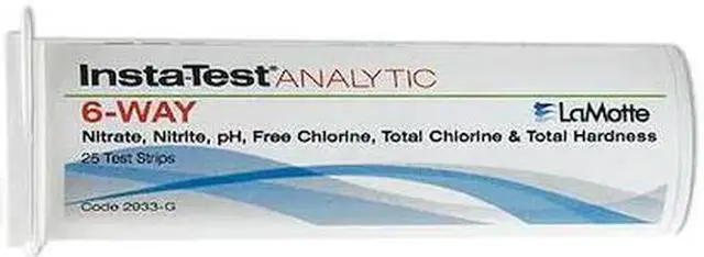 Test Strip, Test Form Strip, Overall Length 5 in, Test Type Test Strips, Testing Parameter One Free Chlorine, Nitrate, Nitrite, pH, Total Chlorine, Total Hardness, Overall Width 1/4 in, Parameter Measurements Included 0 to 10 ppm Free Chlorine, 0 to 10 ppm Nitrite, 0 to 10 ppm Total Chlorine, 0 to 400 ppm Total Hardness, 0 to 50 ppm Nitrate, 4 to 10 pH, Number of Tests 25, pH Resolution 1.0 pH, Test Detects For Free Chlorine, Hardness, Nitrate, Nitrite, pH, Total Chlorine.