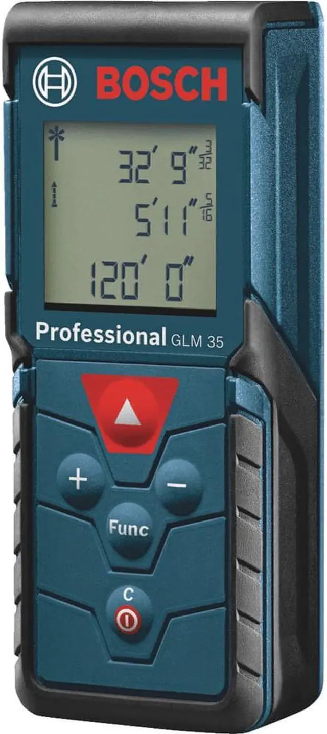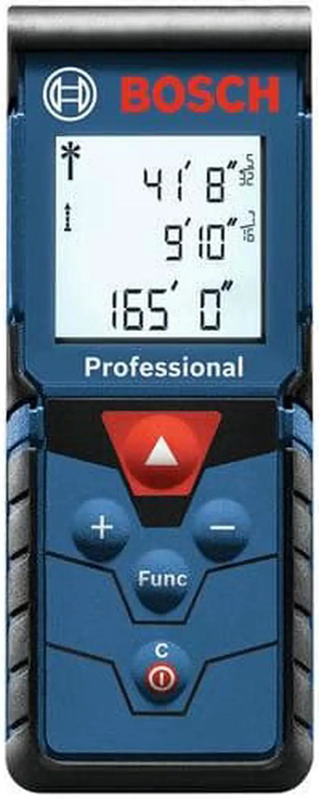 The Bosch BLAZE Pro GLM165-40 165 ft. Laser Measure is a fully featured yet simple-to-use tool. It provides an easy-to-read backlit display that illuminates the measurements, and it delivers real-time distance, distance, area, volume and indirect measuring functions. It has a 10-measurement storage capability. This measure has addition/subtraction functionality, so the user can add or subtract measurements. The BLAZE Pro includes default real-time measurement mode, adjusting the measurement the closer to or further from the target the laser measure is. It has laser precision technology and real-time measurement mode, for instant and reliable measurements up to 165 ft., to size up the job in seconds. It is accurate up to ±1/16 in. and features a digital level. It fits in any pocket for easy access.