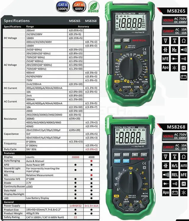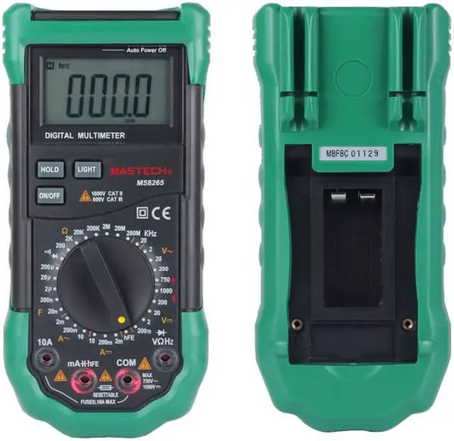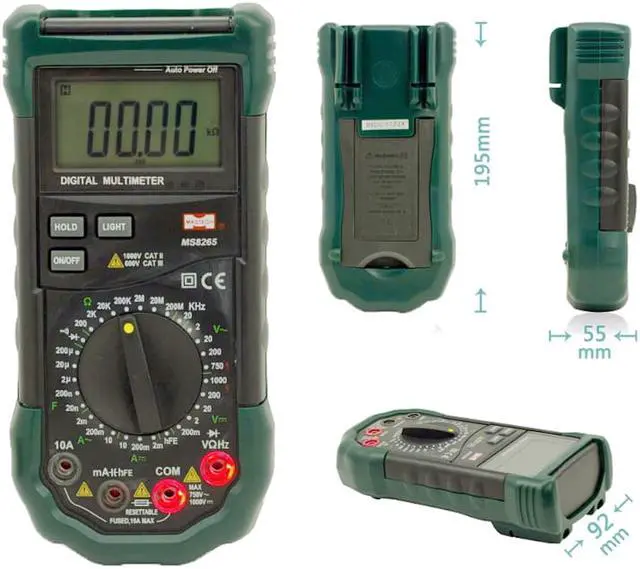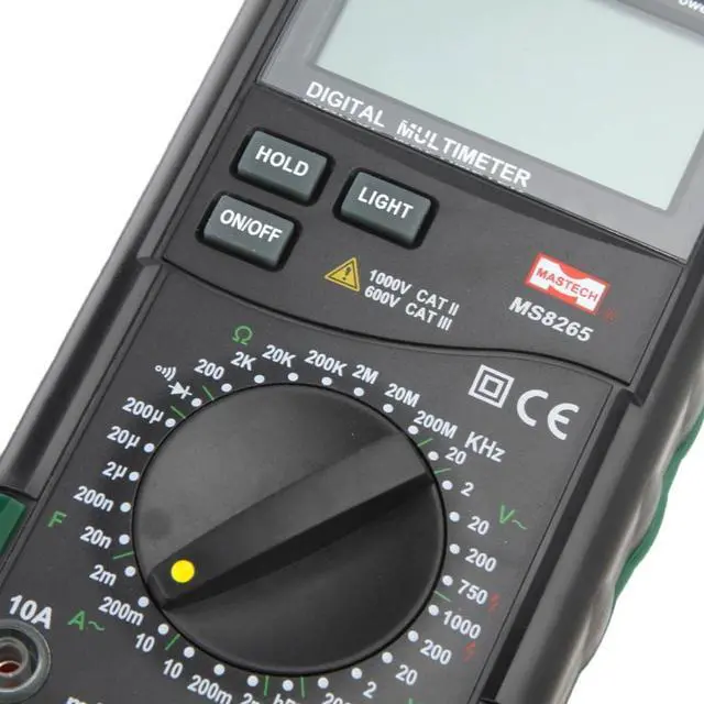 Description: This MS8265 is a fully featured digital multimeter. It is capable of most standard functions including AC/DC Voltage and Current, Resistance, Capacitance, Frequency, Temperature and more. It's also packed with many nice features, such as back light, data hold, reset table fuse. No matter you are a professional or just a DIYer, this is a great and affordable tool for your daily use.