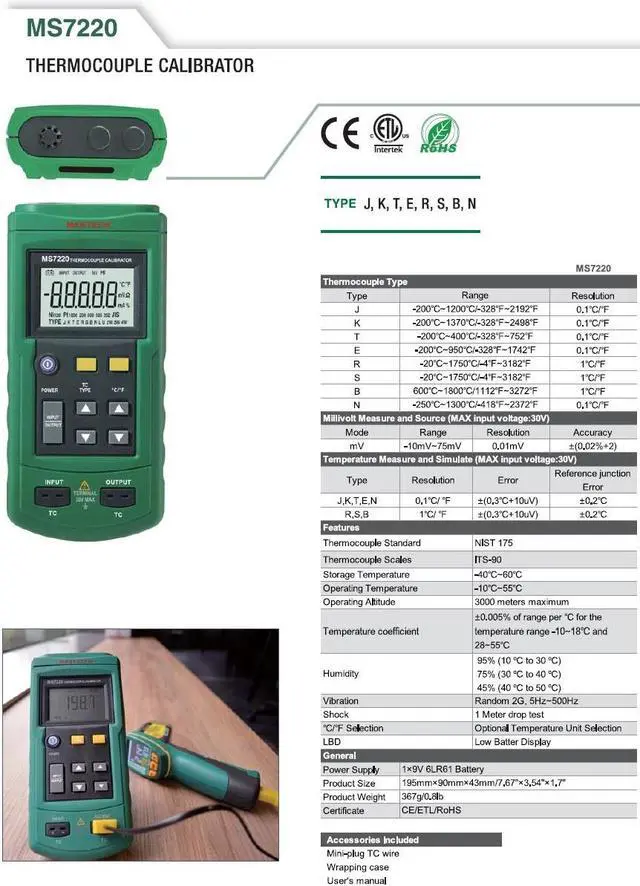 MASTECH MS7220 Professional Thermocouple Simulator Calibrator Tester Meter Thermocouple Measurement/Simulation Simulate Tools