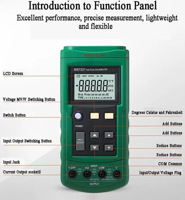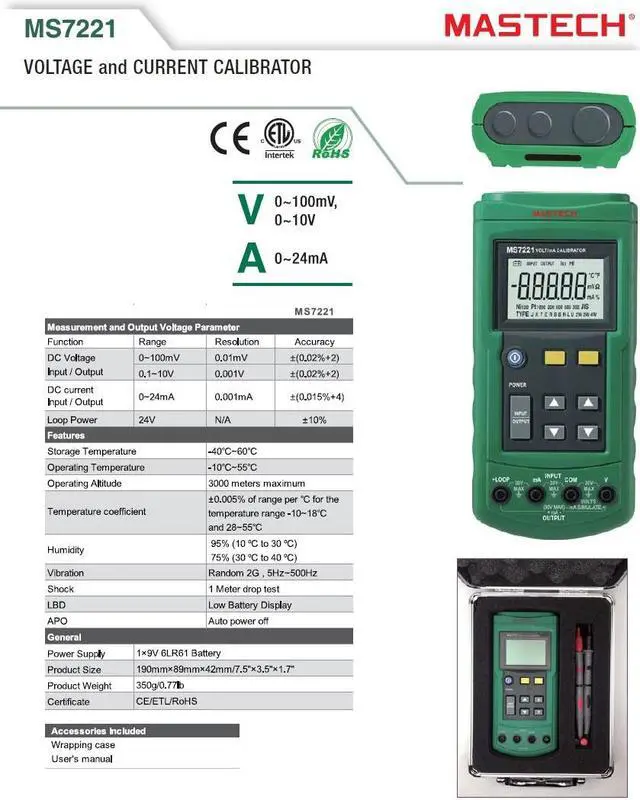 MS7221 Volt/mA Calibrator is a source and measurement tool. This calibrator can be used in measurement output 0 to 24 mA DC current loop, and 0 to 10V DC voltage. But the calibrator cannot be used to measurement and source simultaneously.