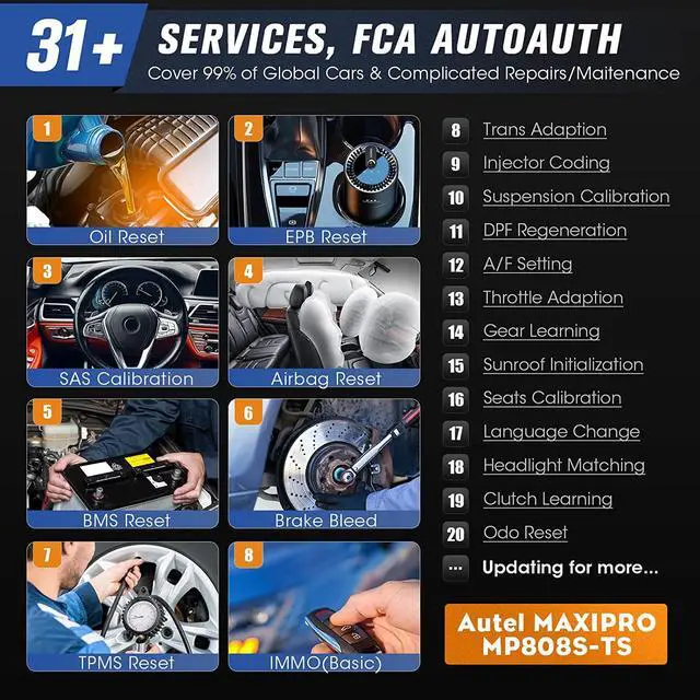 Autel diagnostic scanner MaxiPRO MP808S-TS provides mechanics, technicians, and repair shops/workshops with various daily auto maintenance functions, such as Resets, Adaptations, Initializations, Matching, Calibrations, Adjustments, etc.