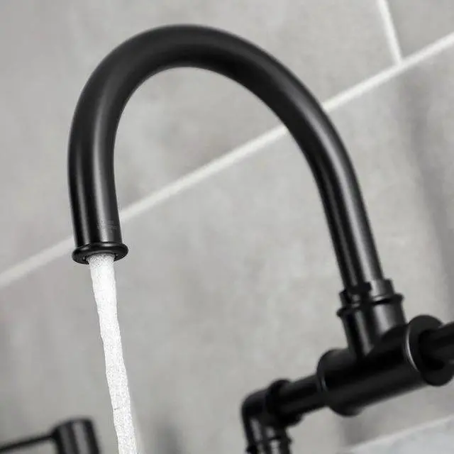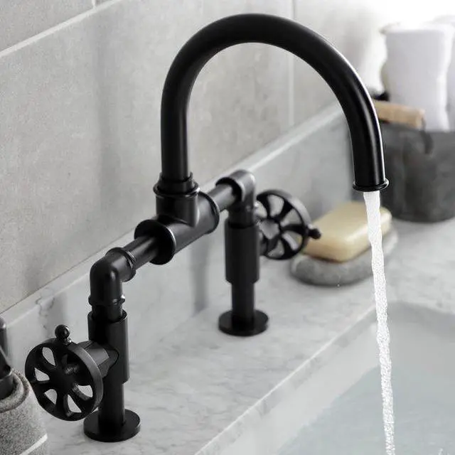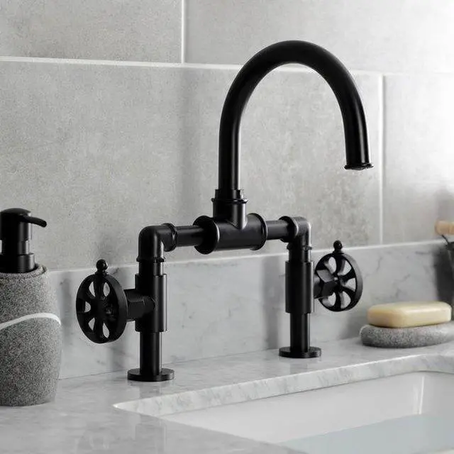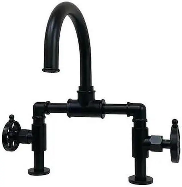 California Proposition 65: This product contains a chemical known to the State of California to cause birth defects or other reproductive harm. The exquisite design of this faucet tastefully flatters the elegant architecture of traditional homes with its fine detailing. Elegantly designed, the exquisite arch connecting the spout to the handles provides an added aesthetic appeal to make for more of a statement piece. Additionally, the 7-15/16 inch of spout clearance make for a very easy hand washing experience with plenty of room for other tasks. The Belknap industrial style wheel handle bridge bathroom faucet and its featured sturdy brass construction and premium matte black finish are guaranteed to glamorize your home's traditional ensemble for years to come. A matching finish push pop-up drain is also included.