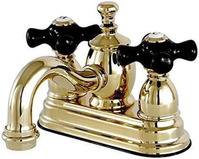 California Proposition 65: This product contains a chemical known to the State of California to cause birth defects or other reproductive harm. Crafted in commendations to English nobility, the exemplary design of this faucet manifests regality and elegance with its black porcelain handles. Centerset bathroom faucets are ideal for smaller bathrooms and feature an easy 3-hole installation. The Duchess 4-inch centerset bathroom faucet with brass pop-up and its featured sturdy brass construction and premium polished brass finish are guaranteed to glamorize your home's traditional ensemble for years to come. Glamorize your home today with the traditional elegance of this faucet. A matching finish drain is also included.