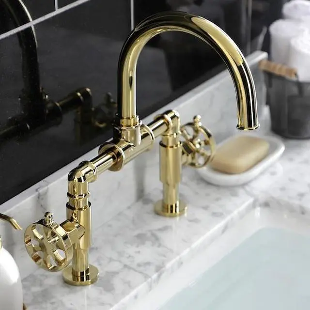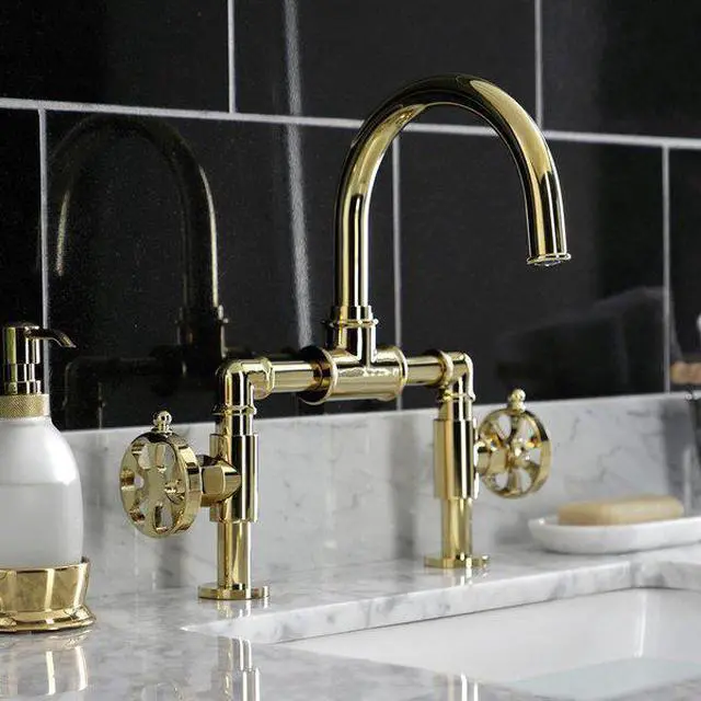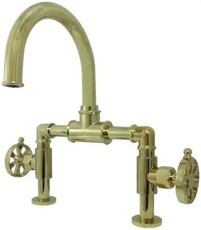 California Proposition 65: This product contains a chemical known to the State of California to cause birth defects or other reproductive harm. The exquisite design of this faucet tastefully flatters the elegant architecture of traditional homes with its fine detailing. Elegantly designed, the exquisite arch connecting the spout to the handles provides an added aesthetic appeal to make for more of a statement piece. Additionally, the 7-15/16 inch of spout clearance make for a very easy hand washing experience with plenty of room for other tasks. The Belknap industrial style wheel handle bridge bathroom faucet and its featured sturdy brass construction and premium polished brass finish are guaranteed to glamorize your home's traditional ensemble for years to come. A matching finish push pop-up drain is also included.