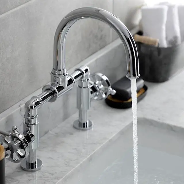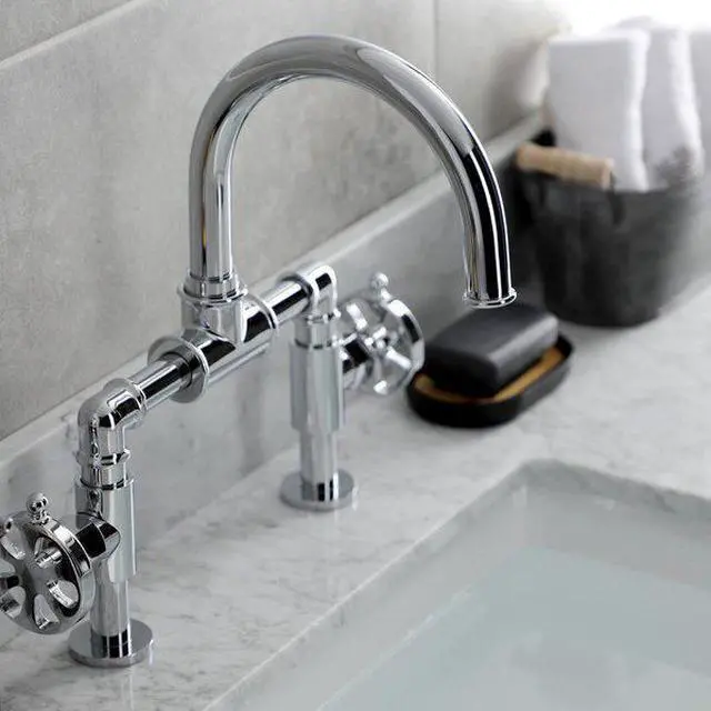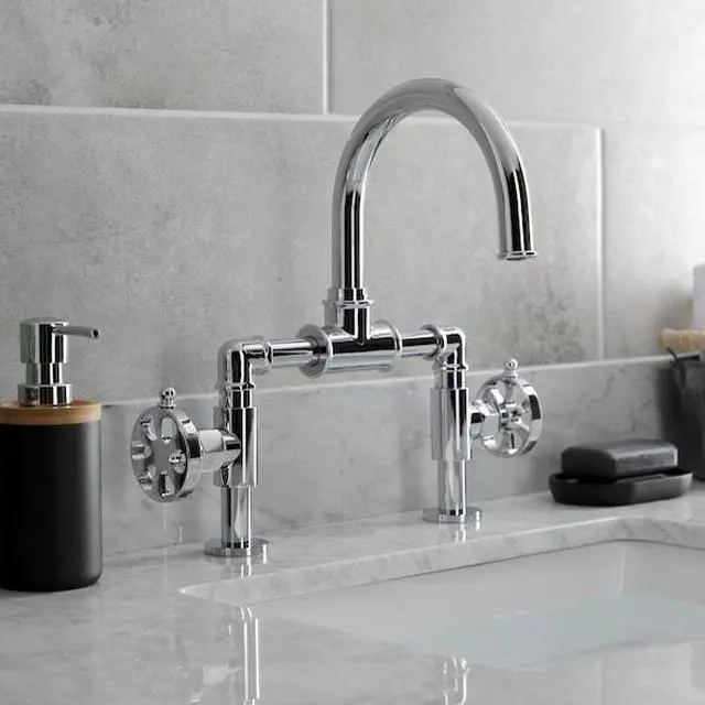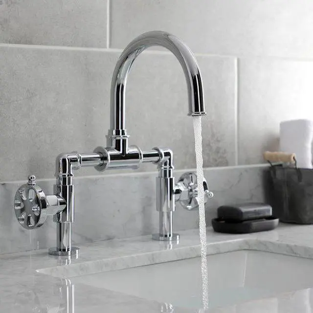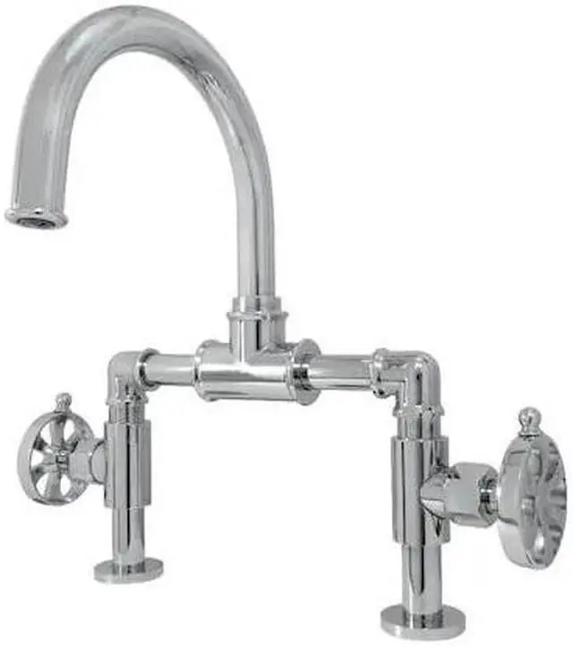 California Proposition 65: This product contains a chemical known to the State of California to cause birth defects or other reproductive harm. The exquisite design of this faucet tastefully flatters the elegant architecture of traditional homes with its fine detailing. Elegantly designed, the exquisite arch connecting the spout to the handles provides an added aesthetic appeal to make for more of a statement piece. Additionally, the 7-15/16 inch of spout clearance make for a very easy hand washing experience with plenty of room for other tasks. The Belknap industrial style wheel handle bridge bathroom faucet and its featured sturdy brass construction and premium polished chrome finish are guaranteed to glamorize your home's traditional ensemble for years to come. A matching finish push pop-up drain is also included.