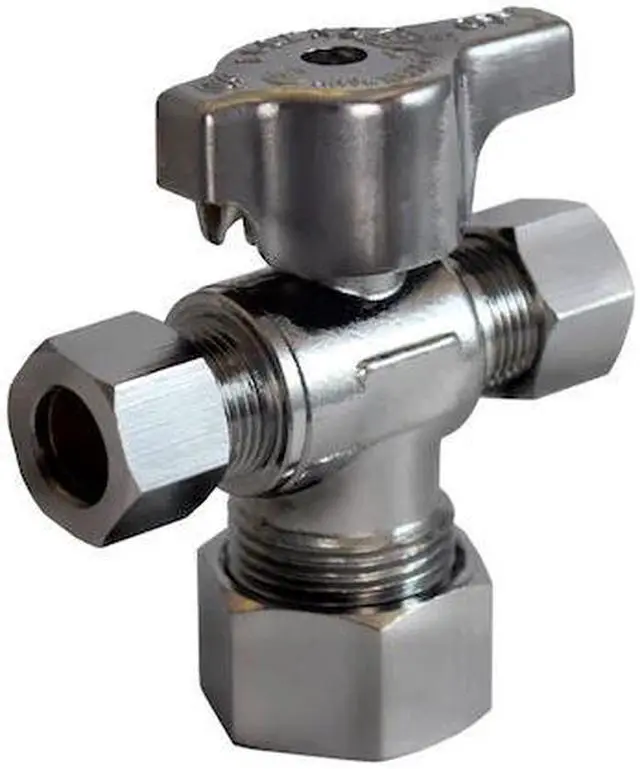 California Proposition 65: This product contains a chemical known to the State of California to cause birth defects or other reproductive harm. 5/8" OD x 3/8" OD x 1/4" OD T-597NL No Lead Chrome Brass Dual Outlet 1/4 Turn Stop Valve