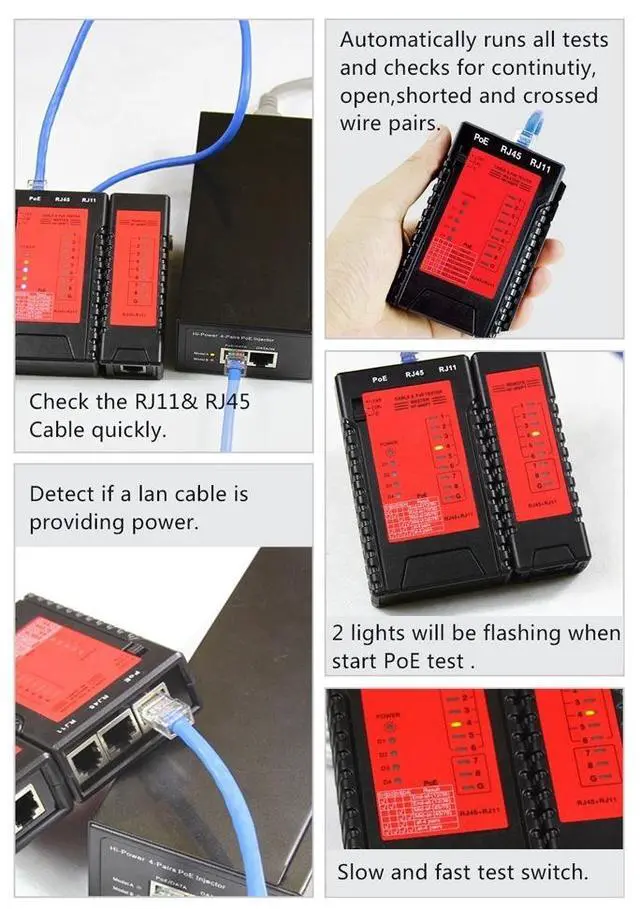 • Test RJ45, RJ11 telephone cables and network cables and detect POE quickly.