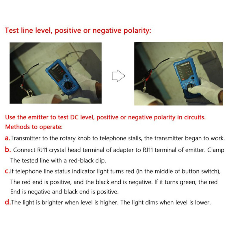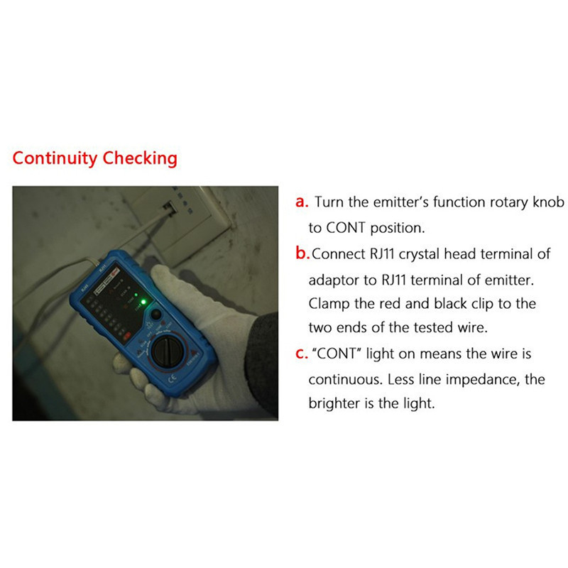 • Wire Tracing: Trace RJ11, RJ45, cables or other metal wire (via adapter)