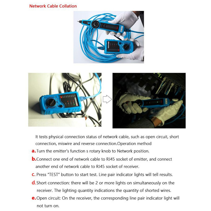 • Network cable collation: Judge short-circuit, breaking circuit, open circuit and crossing