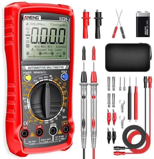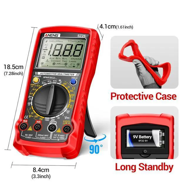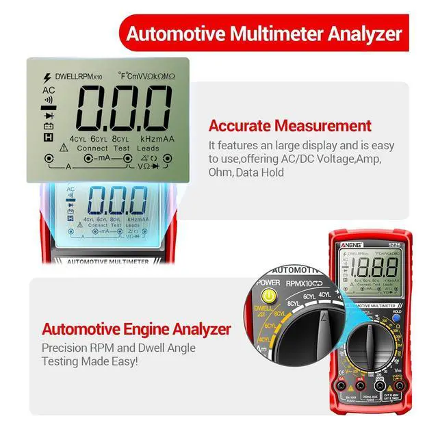 Versatility:SZ26 Multimeter supports a wide range of functions,including 500-10000RPM tachometer readings,dwell angle,DC current,AC/DC voltage,resistance,and duty cycle.Perfect for automotive diagnostics, it's an essential tool for mechanics,engineers,and DIY enthusiasts