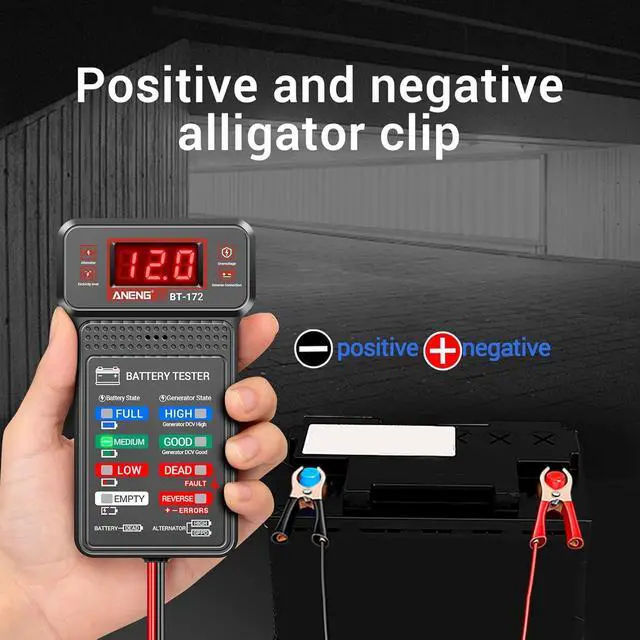 Easy to Use: BT172 offers three modes for testing the alternator, 12V battery tester, In the middle mode, the LCD screen shows real-time voltage while LEDs indicate the alternator status. Switching to the 12V mode displays the real-time voltage on the LCD screen, with LEDs indicating the battery status.Note:Properly connect the meter battery clamps to the battery terminals: attach the red alligator clip to the positive terminal and the black alligator clip to the negative terminal.