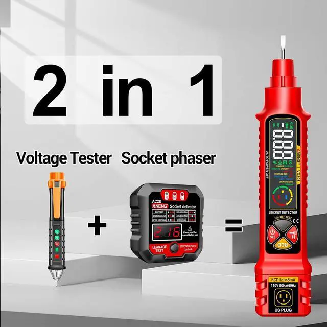 Upgraded 2-in-1 Voltage TesterVD808 combines non contact voltage detector and a socket circuit tester in one compact tool.Dual Range AC 2-440V,50Hz-60Hz Live/Neutral Wire Tester with LCD Display,Breakpoint Finder,Light Fuse Tester,Power Socket Checker Automatic Circuit Tester & Polarity Voltage Test Wall Plug Electrical Tools