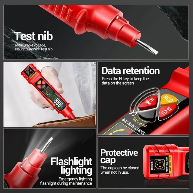 NCF Detector & Leakage TesterVD808 ensures safety with alarms. Insert the detection pin into an AC socket or position it near a cable. Accurately detects AC signals, activating LED lights and beeping. Built-in live wire detector identifies live or neutral wires automatically. One-click test button for correct wiring and trip function. Press it; if the receptacle trips, power leak-proof protection is good. Test the system for household electrical safety against the risk of electric shock