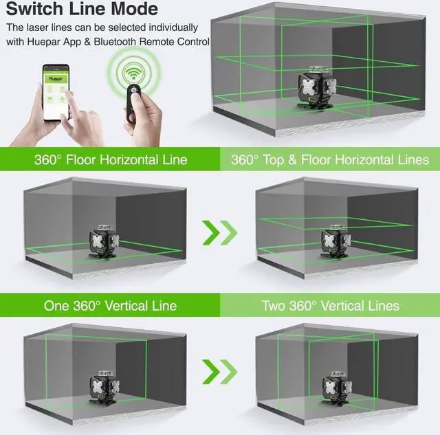 The Bluetooth remote control / Huepar APP enables to select four 360° laser lines individually at a distance up to 98Ft.