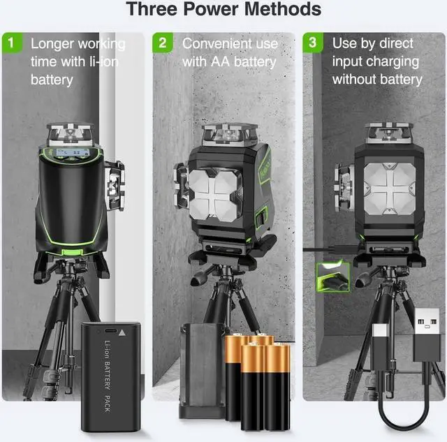 Triple Power Methods & Type-C Charging PortThis 360 laser tool adopted 7.4V / 2600mAh Li-ion battery (can be purchased easily at local market) for extended run-time, or with 4 AA alkaline batteries (with a battery holder). Besides, this 4D laser level can be used at job site by plugged in when take out the battery. With Type-C charging port, the 16 lines laser level can also be charged by laptop, power bank, car charger, etc.