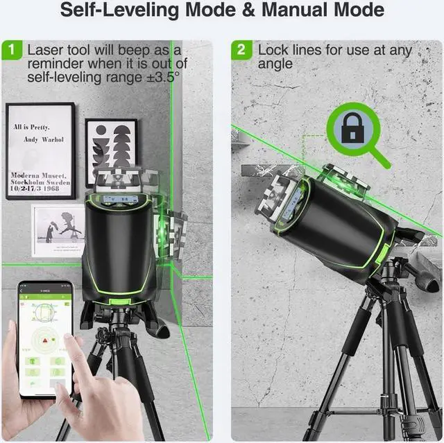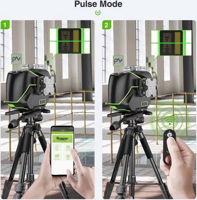 Multifunctional Laser ToolThe four 360° laser planes can be selected individually by separate H and V button on the keypad. With smart pendulum, the laser tool self levels and indicates out-of-level condition while pendulum unlocked. The line laser will beep when out of self-leveling range ± 3.5 °. Once pendulum locked, it switches to manual mode to lock lines for use at any angle. Pulse mode extends laser range up to 200Ft. with Huepar Laser Receiver LR-6RG/LR-5RG.