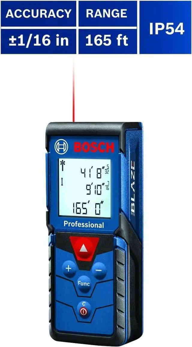 The Bosch BLAZE Pro GLM165-40 165 Ft. Laser Measure is a fully featured yet simple-to-use tool. It provides an easy-to-read backlit display that illuminates the measurements, and it delivers distance, square footage, volume and indirect measuring functions. It has a 10-measurement storage capability. This measure has addition/subtraction functionality, so the user can add or subtract measurements. The BLAZE Pro includes default real-time measurement mode, adjusting the measurement the closer to or further from the target the laser measure is. It has laser precision technology and real-time measurement mode, for instant and reliable measurements up to 165 feet, to size up the job in seconds. It is accurate up to +/-1/16 inch. It fits in any pocket for easy access.
