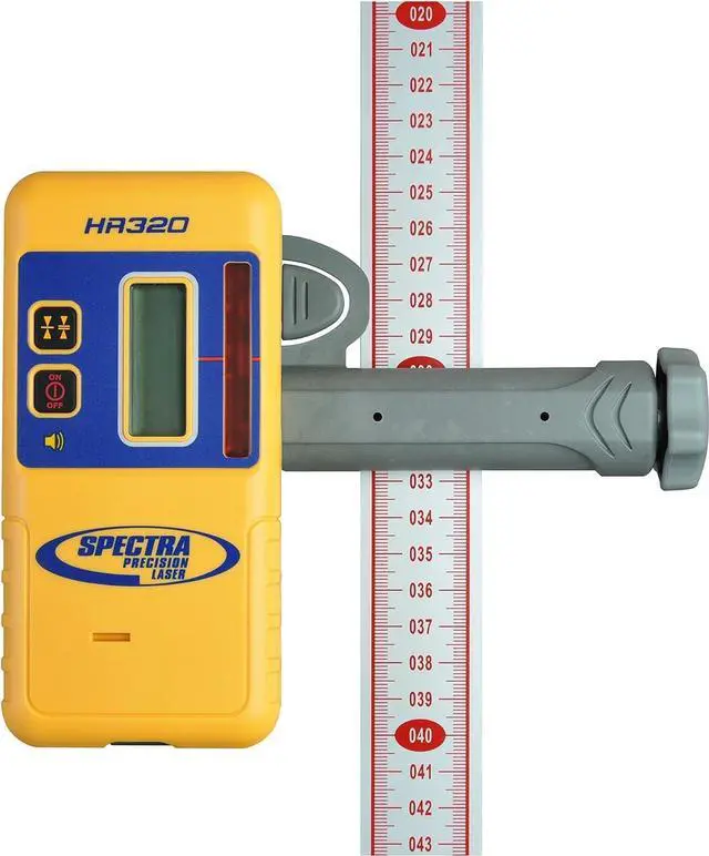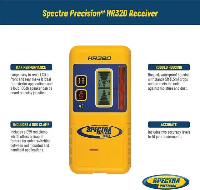 The Spectra Precision HR320 Laser Receiver is a durable laser receiver for general leveling applications. Dual LCDs on the front and back display a 5-segment grade arrow that indicates grade position. Two on-grade sensitivity settings (fine and coarse) give it the ability to quickly find grade and adjust to jobsite conditions. A loud 100 dBA speaker is designed to be heard on noisy job sites and has three adjustable speaker levels (loud, low, and off). The HR320 is typically used with lasers such as the LL100 and HV101 but can also be used with most red beam rotating lasers.