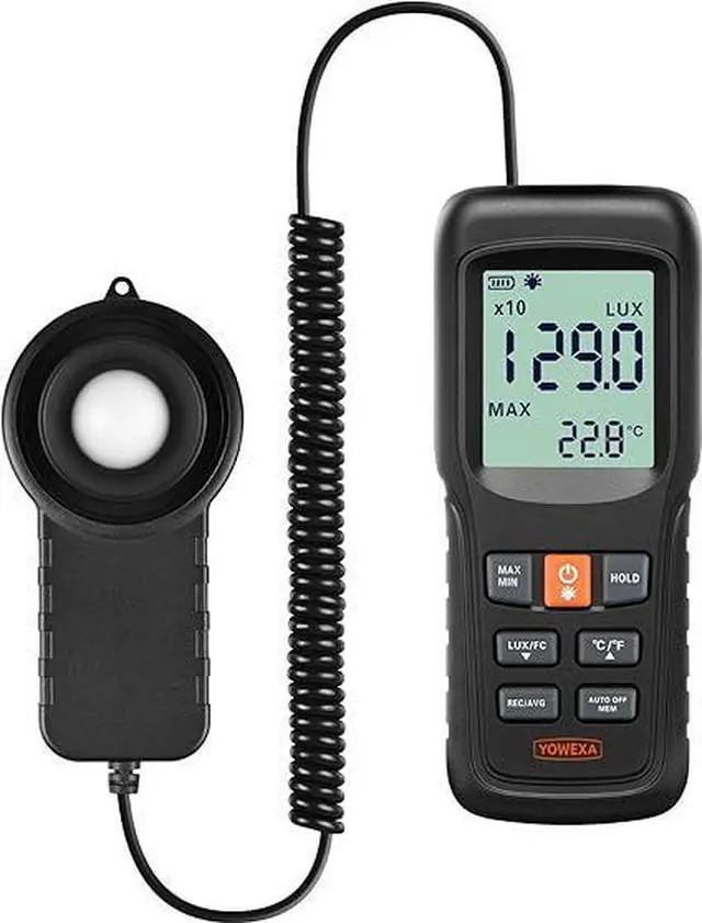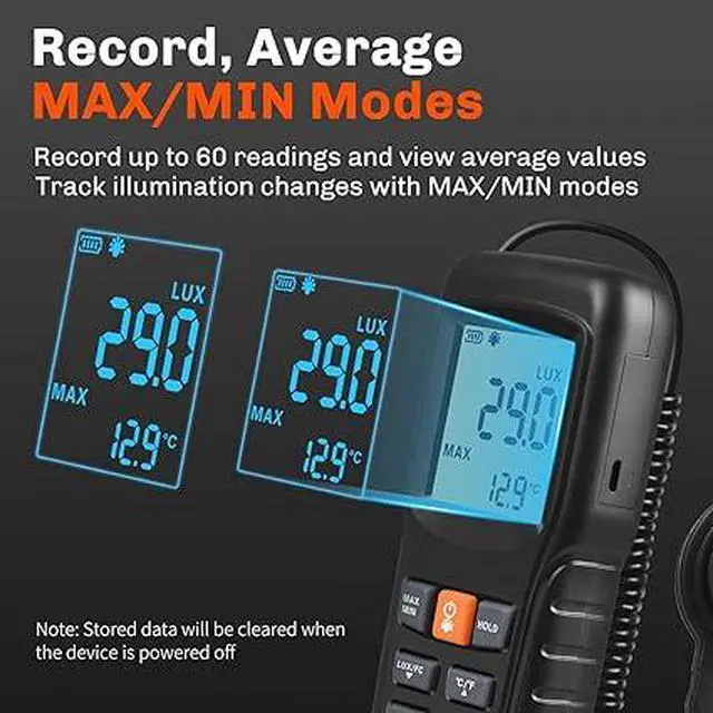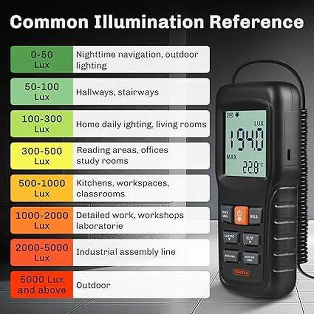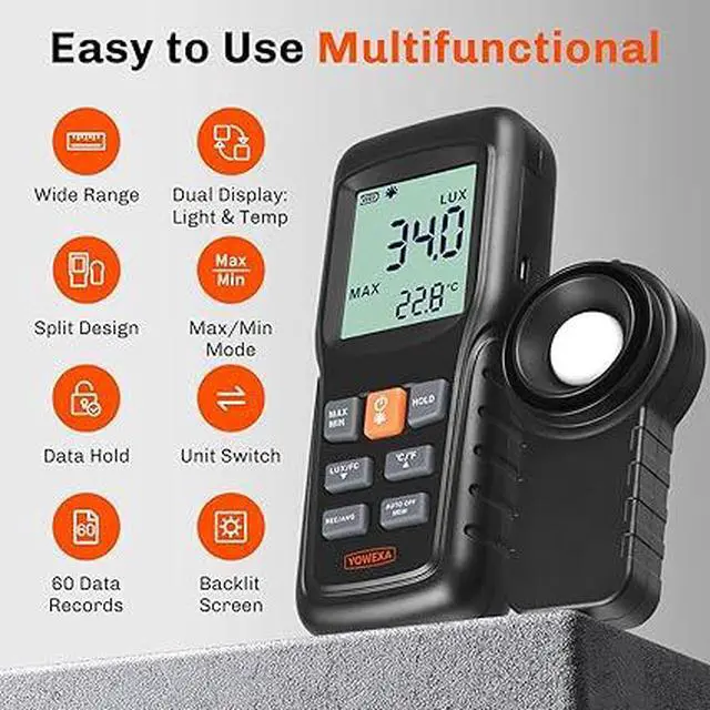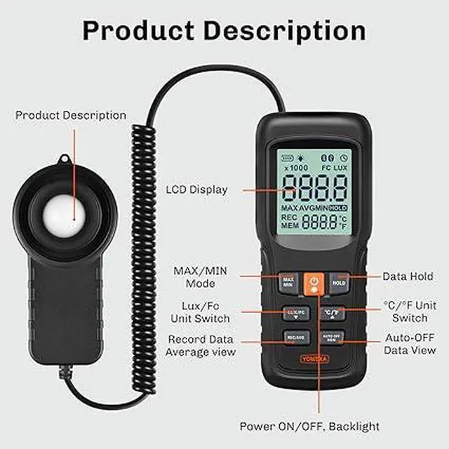 Illuminance & Temperature Display: Displays both light intensity and ambient temperature on screen, with switchable Lux/Fc and °C/°F units for versatile use.