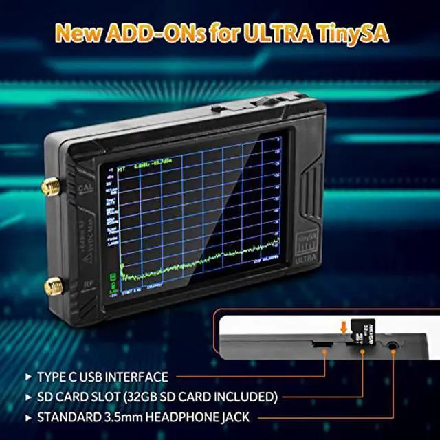 New Add-ons: TinySA ULRRA with 4'' touchscreen display, you can operate on it more easily and read clearly; the build-in SD card slot and the 32gb micro sd card have now solved the issue on saving the onsite data, you could take the tinysa with you at anywhere and anytime; Audio Out, standard 3.5 mm headphone jack, put on the headphone or connect to the amplifier if needed; 3000mAh built-in rechargeable battery, the tinysa can work around 8hrs