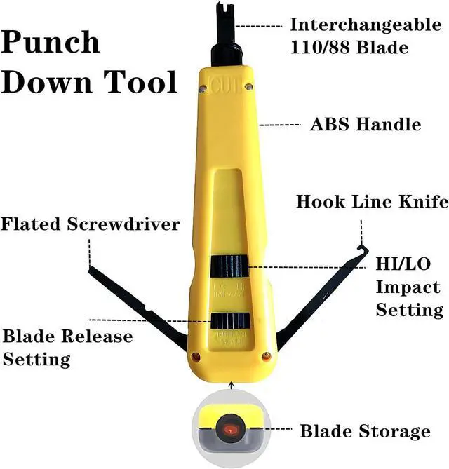 110/88 Punch Down Tool: Comfort grip that is easy to handle, Precise blades are interchangeable and reversible between 110 and 88 standards. Inserts and cuts terminations in one simple operation for Cat6a /Cat6 /Cat5e /Cat5 Network Cable.
