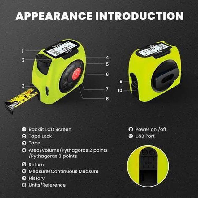- The laser is automatically turned off (after 30 seconds), the power is automatically turned off (after 3 minutes). The product includes: one set of tape measure rangefinder, one manual, one USB charging cable.