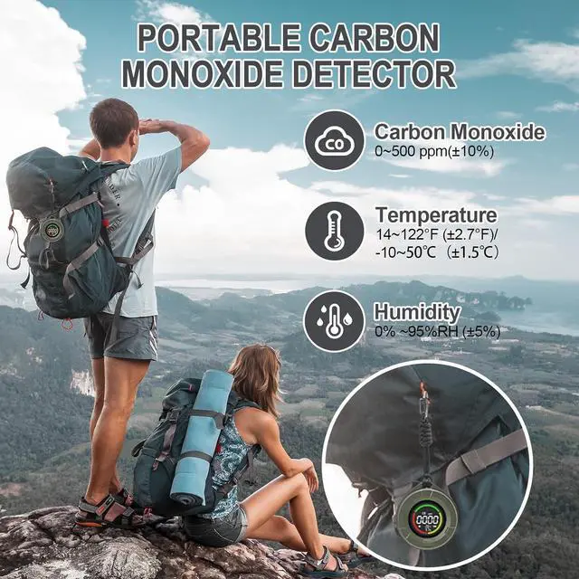 [High-Precision 3-in-1 Carbon Monoxide Detector] This portable 3-in-1 carbon monoxide detector monitors carbon monoxide levels, temperature, and humidity in real time. Equipped with a high-precision sensor with a 10-year lifespan, it measures carbon monoxide levels from 0500 PPM, temperatures ranging from 14122°F (-1050°C), and relative humidity from 095%. Accurate and instant readings keep you informed of the air quality in your environment at all times.