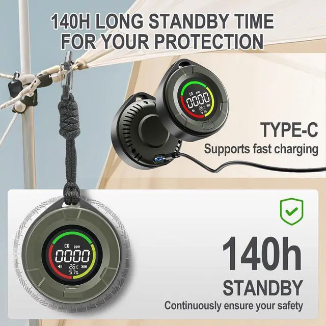 High-Capacity Battery & Fast ChargingThis 3-in-1 CO monitor is equipped with a 1000mAh lithium-ion battery and supports 1065W fast charging. Using a Type-C fast charger, it takes just 1 hour to charge (typically 4 hours). After 5 minutes of inactivity, the CO detector enters a low-brightness power-saving mode, providing up to 140 hours of standby time. Ideal for travel, camping, or outdoor activities