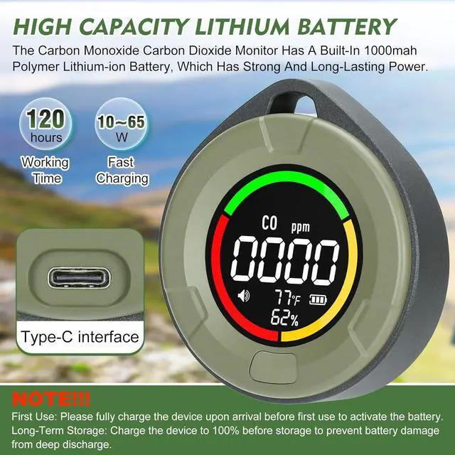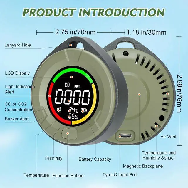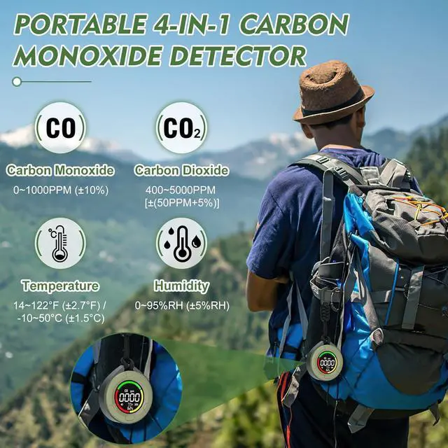 [Portable 4-in-1 Carbon Monoxide and Carbon Dioxide Detector] The portable 4-in-1 carbon monoxide detector monitors current levels of carbon monoxide, carbon dioxide, temperature, and humidity in the air in real time. Equipped with high-precision sensors (10-year lifespan), it detects carbon monoxide concentrations ranging from 0 to 1000 ppm (±10%), the CO concentration range is 4005000 ppm (±(50 ppm + 5%)), the temperature range is 14122°F (±2.7°F) / -1050°C (±1.5°C), and the humidity range is 095% RH (±5% RH). Data is accurate and lag-free, with real-time monitoring.