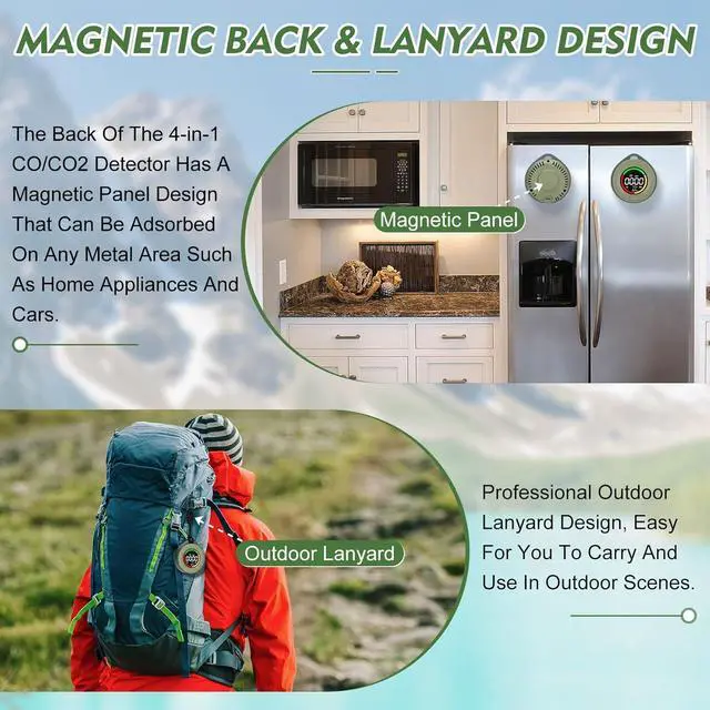 [Outdoor Lanyard and Magnetic Mount] The CO2 air quality monitor can be placed anywhere on a flat surface, such as a table in the living room, kitchen, or bedroom. It also comes with a dedicated outdoor lanyard for easy portability during outdoor activities like travel, camping, picnics, and adventures. The back of the CO2 monitor features a magnetic mount, allowing it to be attached to any metal surface, such as household appliances or a car.
