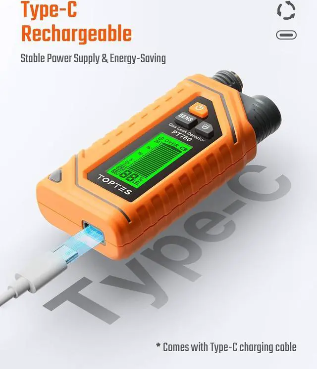 Efficient Charging and Multi-Gas DetectionThe PT760 Rechargeable Gas Detector features a Type-C charging port for swift power replenishment. This device is capable of precisely detecting a range of combustible gases, including LPG, methane, ethane, propane, butane, natural gas, coal gas, and gas fuel, effectively pinpointing any gas leaks. It's an essential tool for your daily gas equipment usage, offering reliable support for maintenance