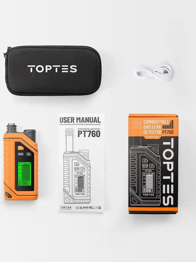 What You Get1x PT760 Gas Leak Detector, 1x Type-C Charging Cable, 1x Protective Case, 1x User Manual.