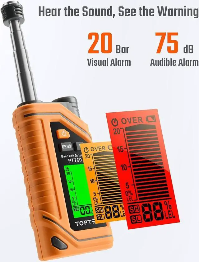 Eye-catching Alerts & %LEL DetectionUpon detecting a gas leak, the PT760 propane leak detector triggers both an audible and visual alarm within 0.5 seconds. You can gauge the severity of the leak by the alarm tone frequency and screen color change. The screen also displays the current lower gas explosion limit value, with a detection range spanning from 1%LEL to 20%LEL (100ppm-10, 000ppm)