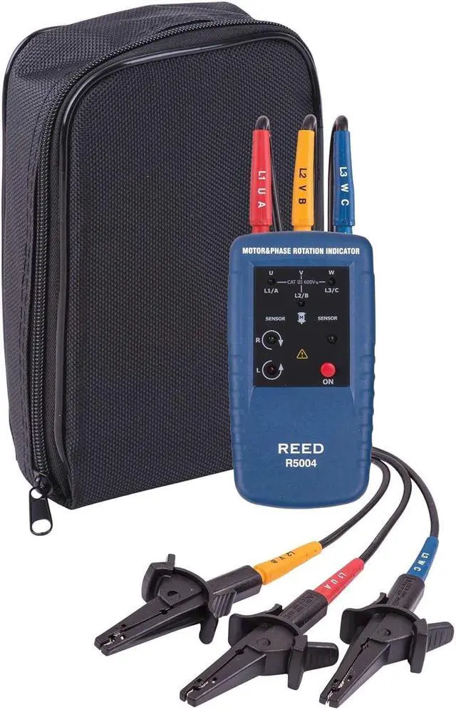 Tests phase orientation of 3-phase power sourcesIndicates phase orientation (clockwise or counter-clockwise) and whether each of the three phases is liveLEDs display motor rotation and phase status