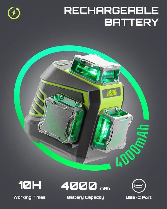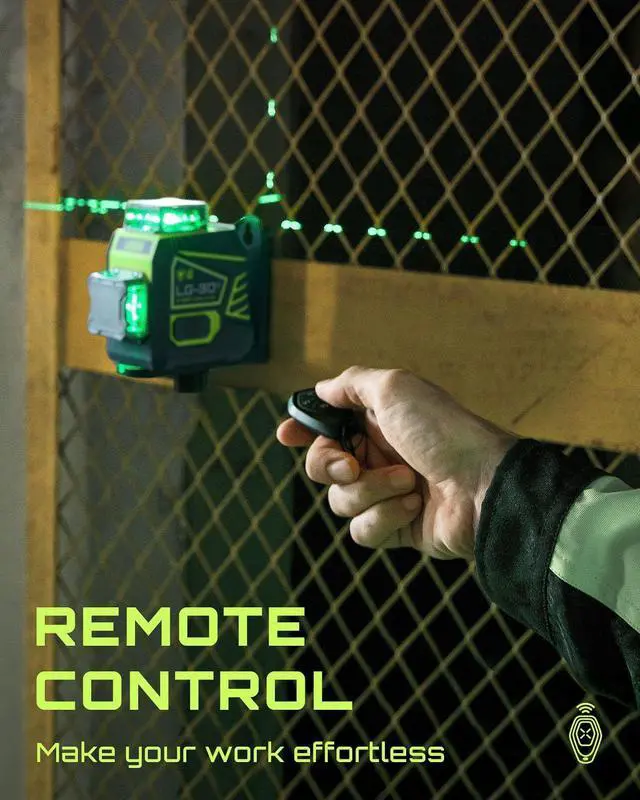 User-Friendly Design - The LG-3Dx laser level is equipped with a straightforward button control panel, making operations effortlessly convenient. It comes with a remote control for remote operation, greatly enhancing work efficiency. A high-capacity 4000mAh battery with a 10-hour working duration ensures full completion of tasksPack Contents - The package contains the LASGOO LG-3Dx laser level, a remote control, a magnetic rotating stand, a Type-C cable, a User Manual and a Portable Storage Bag
