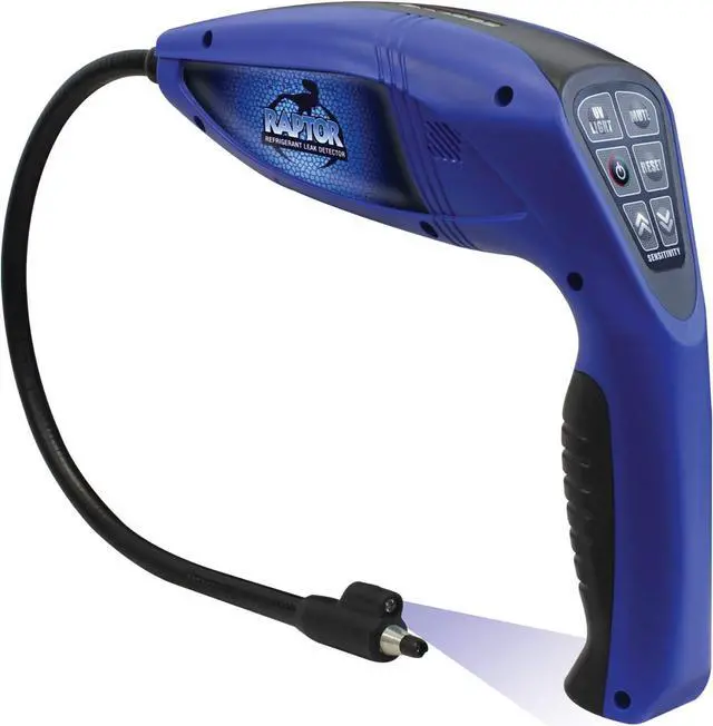 The Raptor refrigerant leak detector by Mastercool offers an accurate and reliable solution to electronic and UV leak detection. This unit offers state-of-the-art features and micro-processing technology while the design sensor delivers a precise and instant response. The ultra-bright UV light built into the end of the probe allows for both electronic and UV leak detection of even the hardest to find leaks. This unit is packaged in a custom molded case with UV glasses, 2 C batteries and sensor tip.