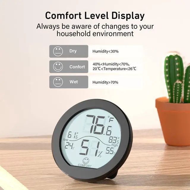 It features a built-in humidity meter with a level icon that indicates the quality of the air (dry/comfort/wet). This allows the humidity sensor to ensure you’re always aware of changes to your household so you can create an optimal environment.