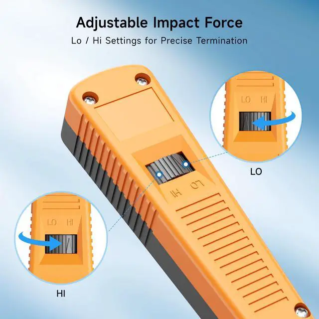 • Adjustable Impact Settings: Fine-tune the force with adjustable impact settings (Lo/Hi) to achieve precise cable terminations into jacks, blocks, or patch panels using 110 IDC terminals. This punchdown tool Cat6 (Cat6 punch down tool / punch down tool Cat6) is perfect for both professional and DIY network setups.